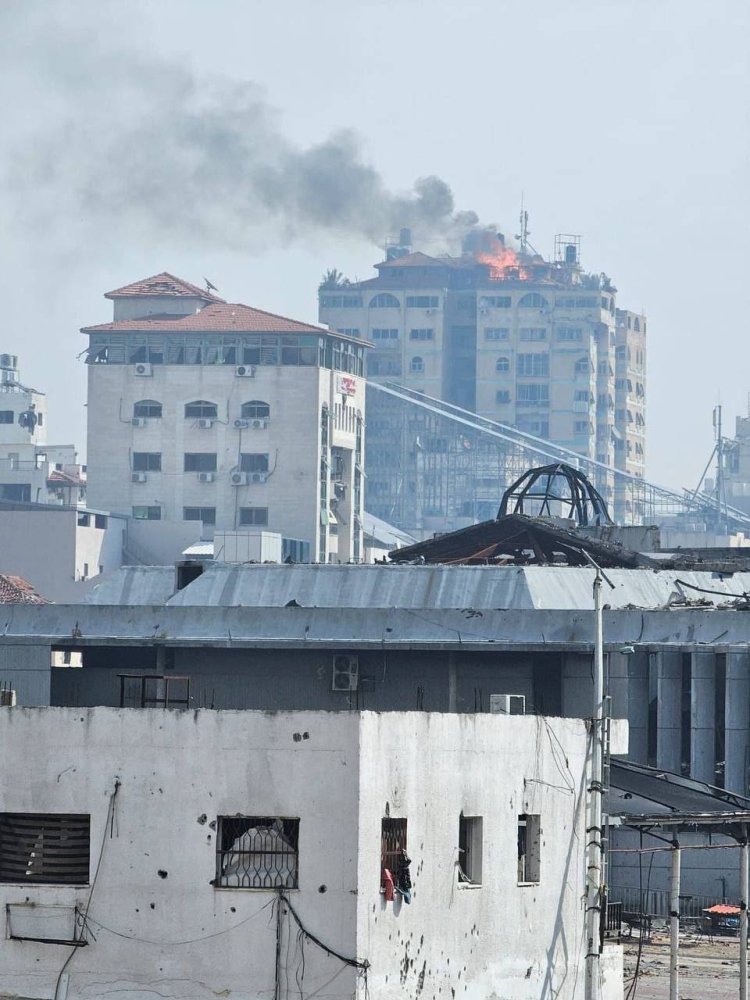 اندلاع حريق بالطوابق العليا من برج الجندي المجهول بغزة جراء القصف الصهيوني.