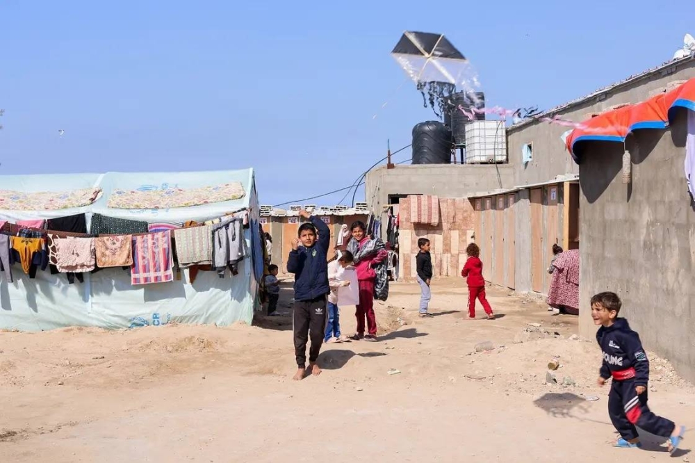 أطفال فلسطينيون أمام مخيماتهم في مدينة رفح.