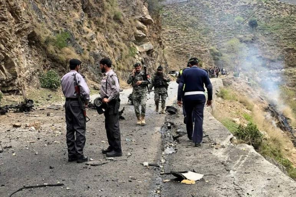 قوات الأمن الباكستانية في موقع التفجير الذي قُتل فيه الصينيون الخمسة
