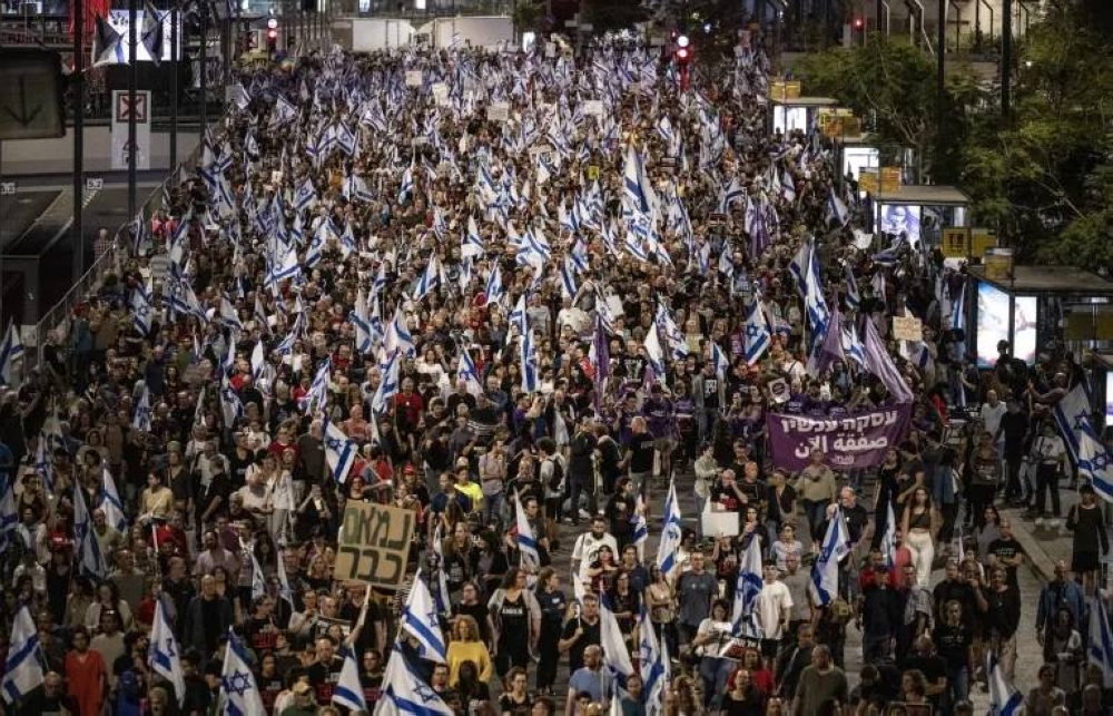 تظاهر آلاف الإسرائيليين اليوم (السبت) في تل أبيب للمطالبة بصفقة تبادل فورية والإطاحة بحكومة بنيامين نتنياهو، ووفقاً لوسائل إعلامية فإن 70 موقعاً في إسرائيل شهدت مظاهرات كبيرة طالب غالبيتها بإنجاح الصفقة والتوجه لانتخابات مبكرة.