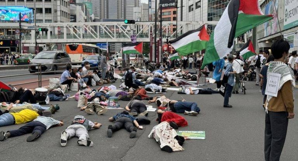 فيما جسد اليابانيون أمام مركز تجاري بمنطقة شينجوكو بالعاصمة طوكيو مشهد ضحايا فلسطينيين قتلوا جراء الهجمات الإسرائيلية على المستشفيات في قطاع غزة.