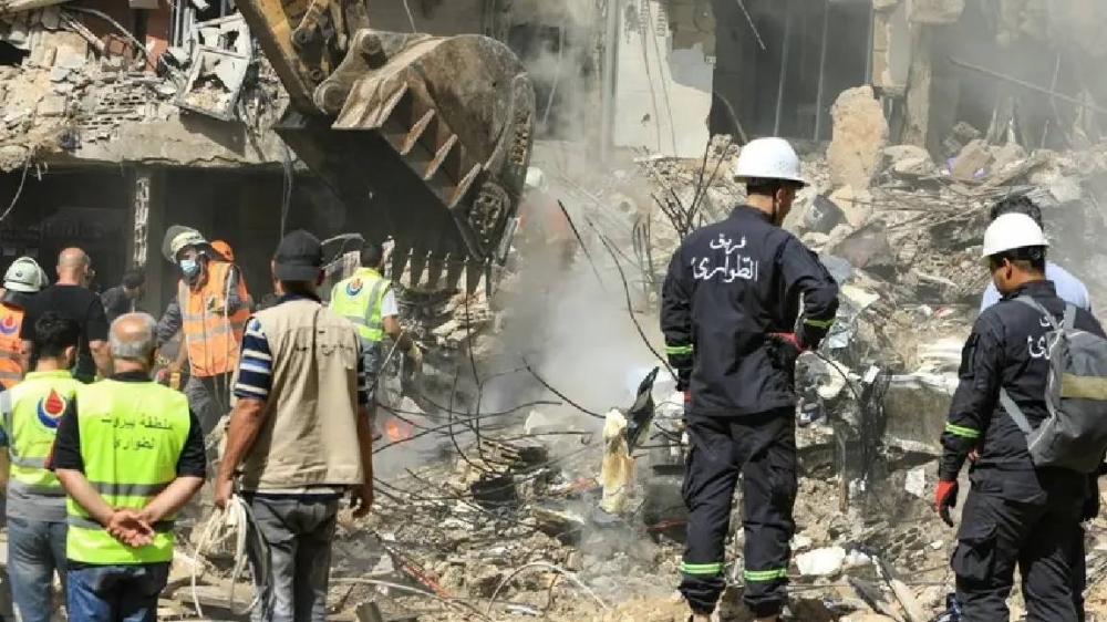 فرق الطوارىء ترفع الأنقاض في الضاحية الجنوبية لبيروت.