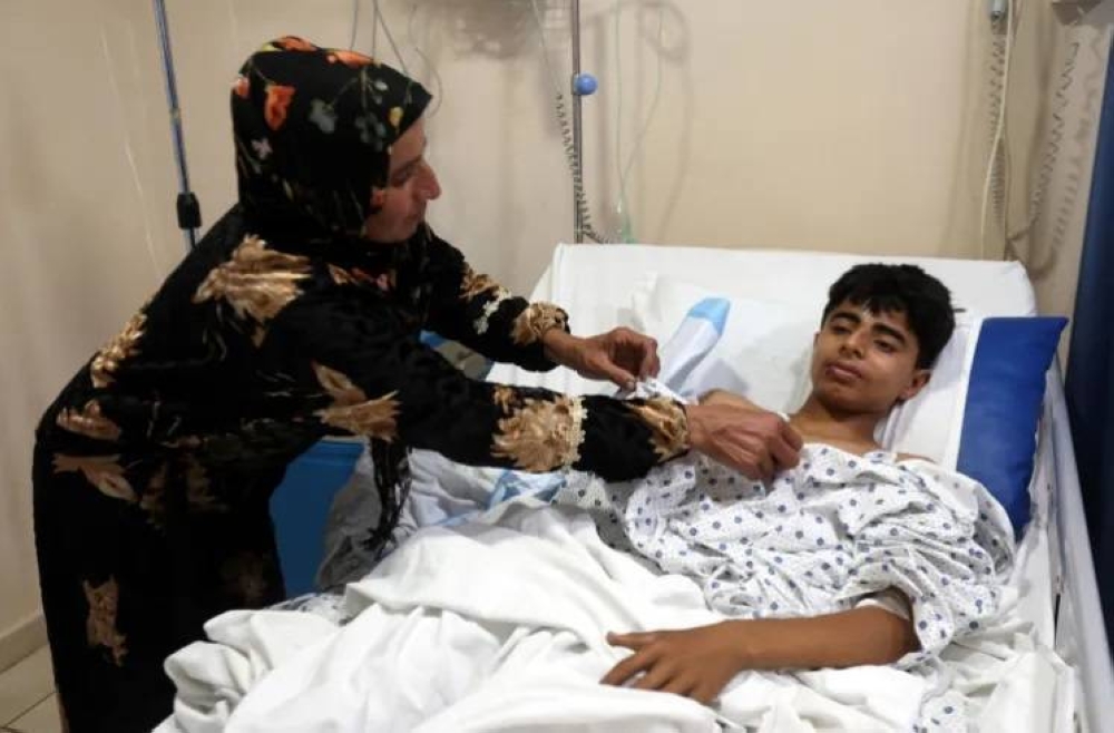 شاب لبناني تحاول والدته مساعدته عقب إصابته بغارة إسرائيلية.