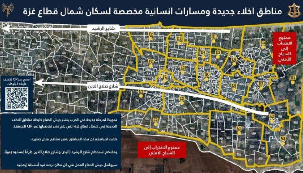 وقال متحدث جيش الاحتلال أفيخاي أدرعي على منصة «إكس»: «تمهيداً لمرحلة جديدة في الحرب ينشر الجيش خارطة مناطق الإخلاء الجديدة في شمال قطاع غزة». وأضاف أن: «نلفت انتباهكم أن هذه المناطق تعتبر مناطق قتال جديدة».