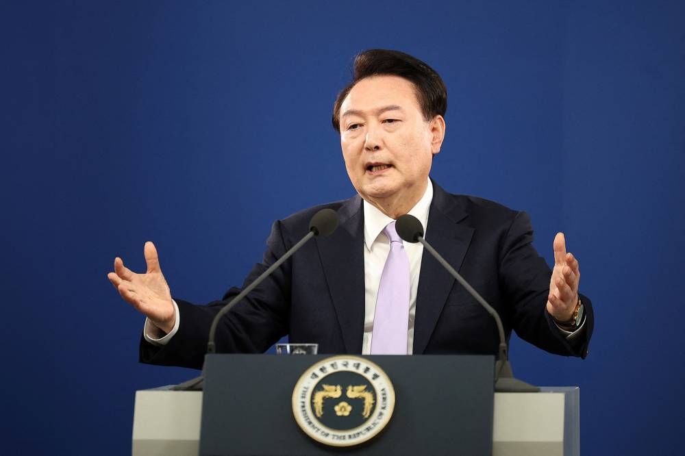 الرئيس الكوري الجنوبي يون سوك يول يتحدث خلال مؤتمر صحفي داخل مكتبه الرئاسي في سول في السابع من نوفمبر تشرين الثاني 2024 . صورة لرويترز من ممثل لوكالات الأنباء .