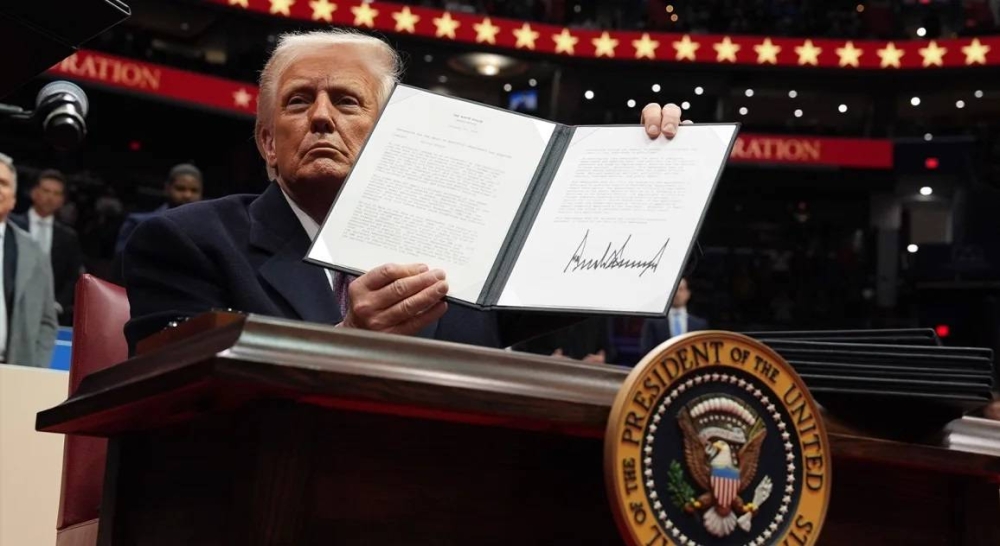 وقع الرئيس دونالد ترامب على أمر تنفيذي أثناء حضوره حفل تنصيب داخلي في كابيتال وان أرينا