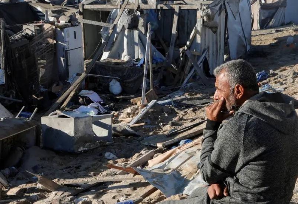 فلسطيني على أنقاض منازل دمرتها إسرائيل في خان يونس.