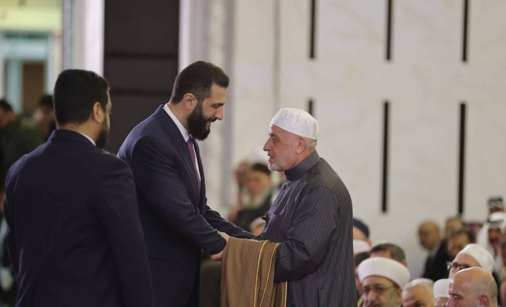 وأقام الشرع صلاة العيد في القاعة الرئيسية في القصر الجمهوري بدمشق ولأول مرة بعد سقوط نظام الرئيس السابق بشار الأسد، وحضر المئات من السوريين والوزراء وقادة من الجيش السوري وعدد كبير من المواطنين ليتم بعدها لقاءات في قصر الشعب لتبادل التهاني مع الرئيس، كما أقيم في ساحة الجندي المجهول فوق جبل قاسيون شمال العاصمة لأول مرة صلاة العيد بمشاركة الآلاف من الرجال والنساء.