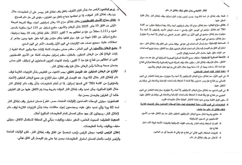 وتنص وثيقة مسودة الاتفاق «المحتمل» بين حماس وإسرائيل والذي سيعلن عنها فور التزام الأطراف بالاتفاق، على أن أمريكا ومصر وقطر ستضمن استمرار وقف إطلاق النار لمدة 60 يوماً، ولأي تمديد محتمل، فيما سيستكمل مبعوث ترمب الخاص تفاصيل الاتفاق ويتولى رئاسة المفاوضات، ويضمن الرئيس الأمريكي ترمب التزام إسرائيل.