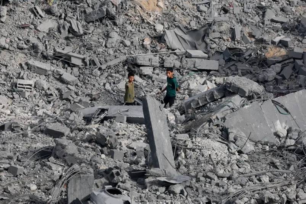 طفلان فلسطينيان على أنقاض منازل دمرتها حرب إسرائيل على غزة .