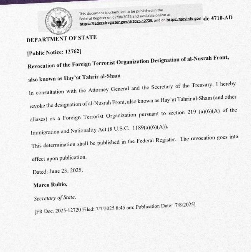 It was reported that the memo, dated June 23, issued by U.S. Secretary of State Marco Rubio in a preliminary version of the federal register, is scheduled to be officially published tomorrow (Tuesday), and the Syrian Foreign Ministry has not yet provided any comment.