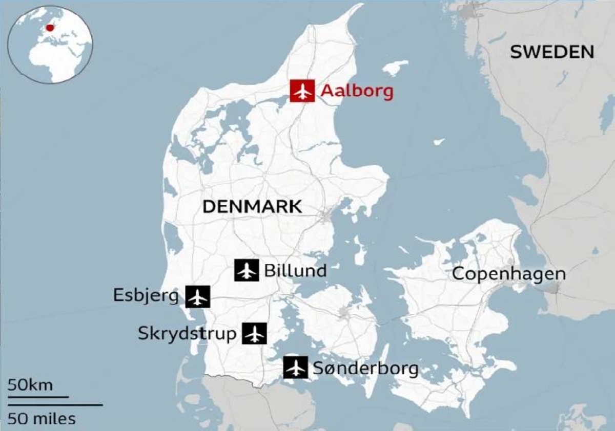 Drones were also spotted last night near Esbjerg and Sonderborg airports, as well as Skrydstrup Air Base, which hosts some of Denmark's F-16 and F-35 fighter jets, and at a military facility in Holstebro, according to police reports to global media, with all affected sites located in the western Jutland Peninsula.