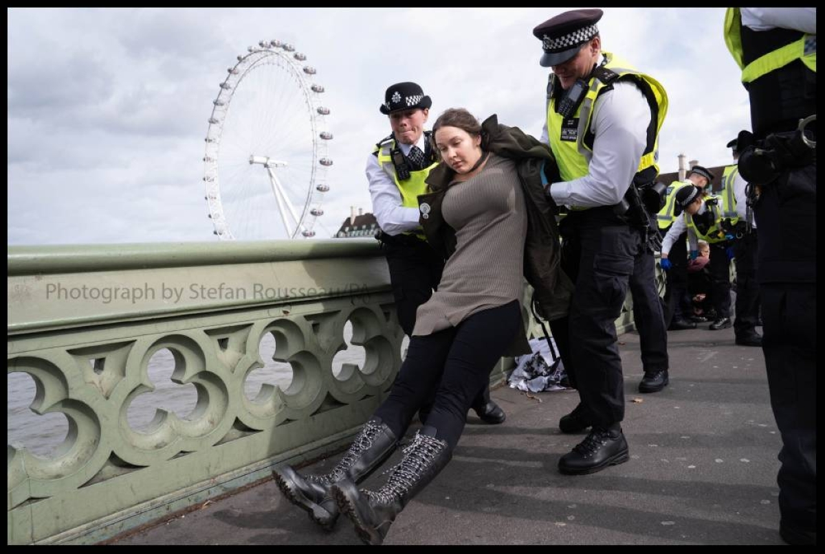 أفادت شرطة العاصمة لندن (ميتروبوليتان) باعتقال مئات المتظاهرين خلال احتجاجات في ميدان ترافالغار وجسر وستمنستر، بتهمة عرض لافتات تدعم حركة فلسطين أكشن، وهي مجموعة محظورة بموجب قوانين مكافحة الإرهاب البريطانية، إذ تم الكشف عن لافتة تؤيد المجموعة على الجسر أثناء المظاهرات المستمرة في وسط المدينة.