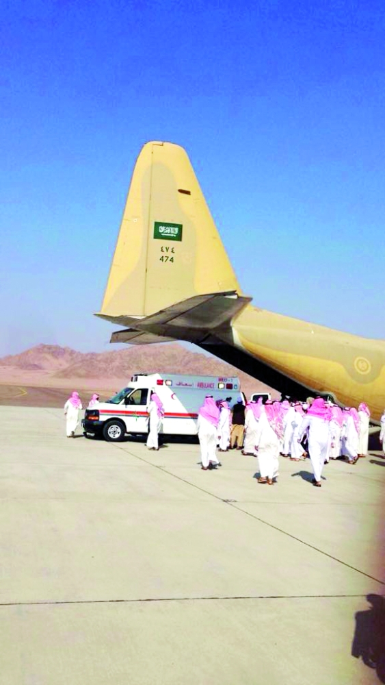جثمان الشهيد العنزي يصل إلى مطار العلا أمس. (عكاظ)