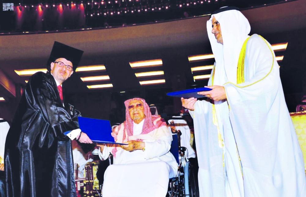 الأمير طلال بن عبدالعزيز يسلم الشهادات للخريجين. (عكاظ)