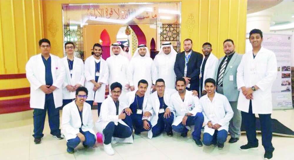 الطلاب المشاركون في الفعالية مع وكيل الكلية. (عكاظ)
