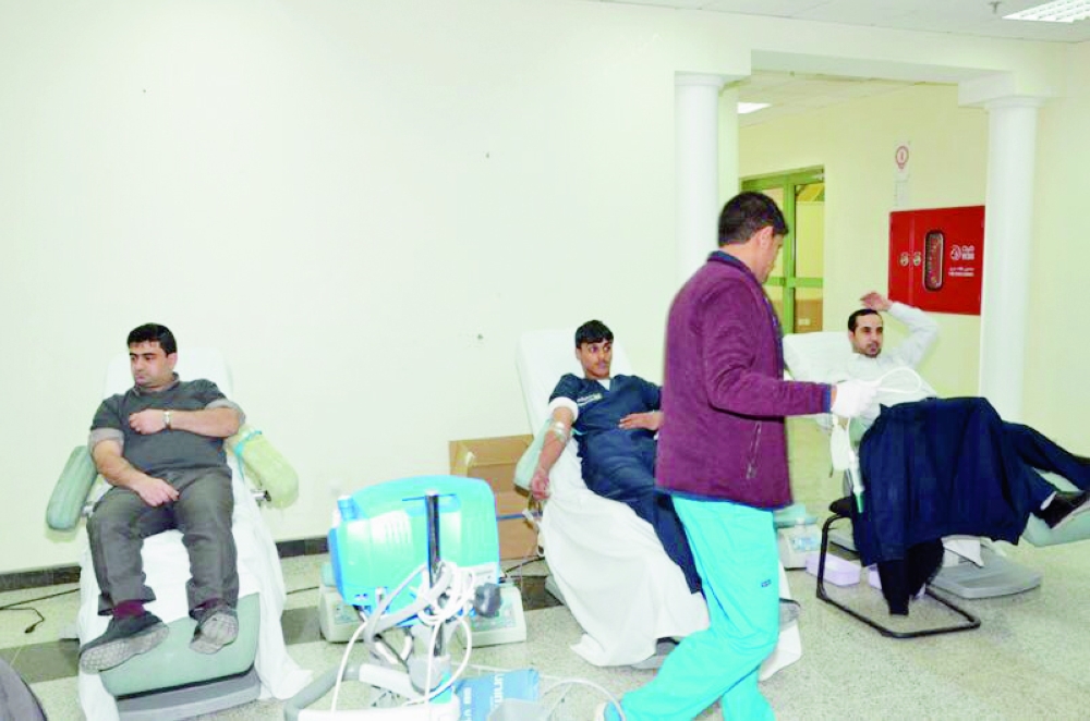 منسوبو تقنية القريات أثناء التبرع بدمائهم. (عكاظ)
