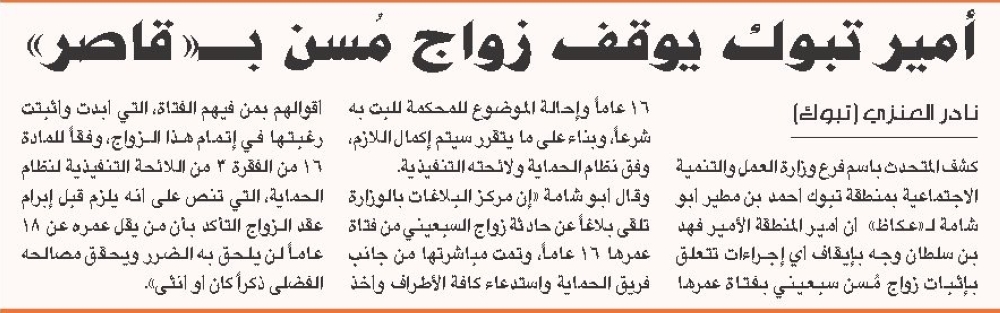 بينما أكد المتحدث باسم فرع وزارة العمل والتنمية الاجتماعية بمنطقة تبوك أحمد بن مطير أبوشامة لـ«عكاظ» أن أمير المنطقة وجه بإيقاف أي إجراءات تتعلق بإثبات زواج مُسن بفتاة صغيرة وإحالة الموضوع للمحكمة للبت به شرعاً، وبناء على ما يتقرر سيتم إكمال اللازم، وفق نظام الحماية ولائحته التنفيذية.