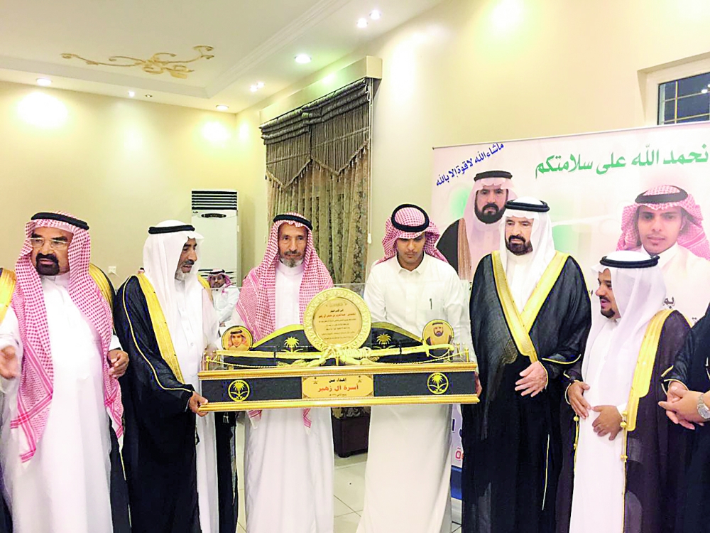 عبدالعزيز ووالده مع أقاربهما محتفلين بمناسبة الشفاء. (عكاظ)