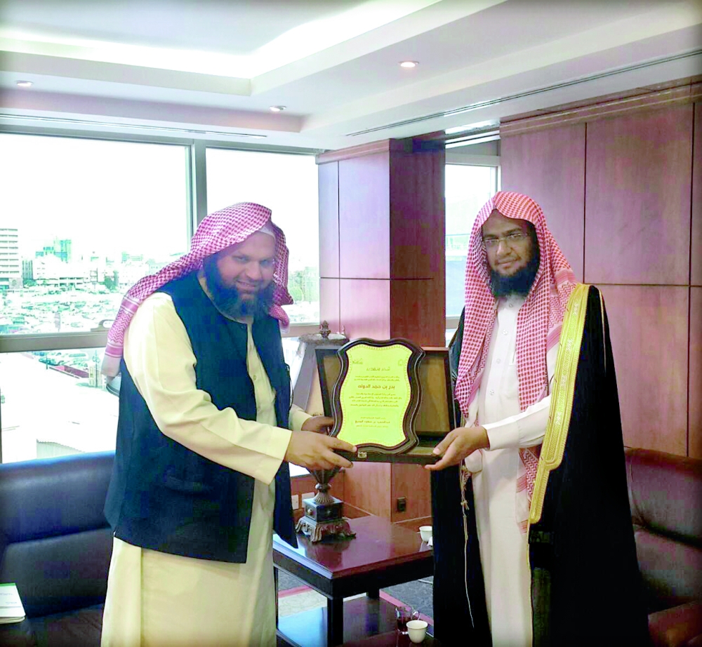 بدر الدولة يتسلم درعا تذكارية من البديع. (عكاظ)