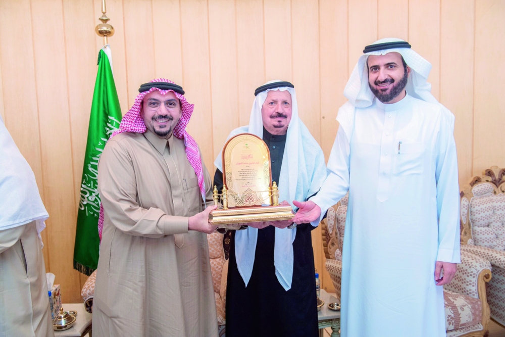 الأمير فيصل بن مشعل مكرما أحد المتبرعين بحضور الربيعة. «عكاظ»