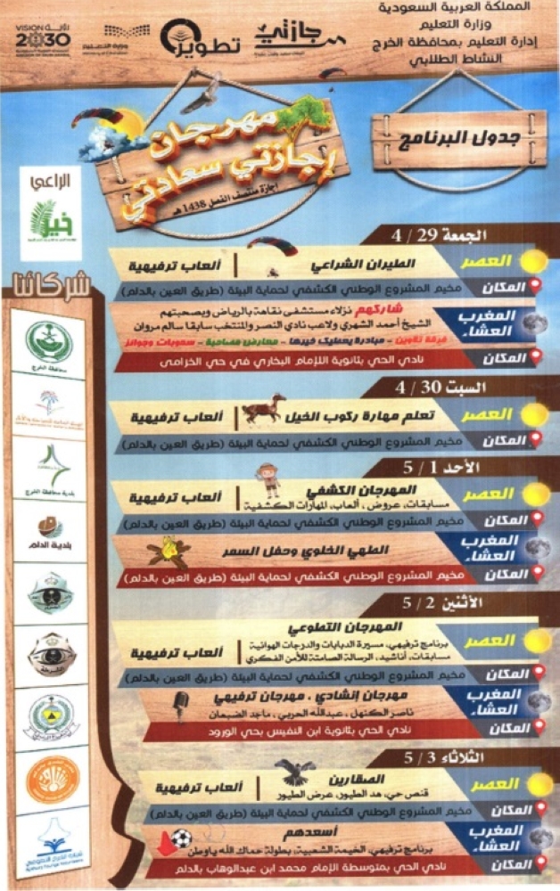 وأوضح مدير التعليم الدكتور عبدالرحمن العبد الجبار أن فعاليات المهرجان تستمر خمسة أيام وتشتمل على العديد من البرامج التي تستهدف أفراد المجتمع لاسيما شريحة الشباب والناشئة التي تقام في مقرات أندية الأحياء في السيح والدلم، ومقر مخيم المشروع الوطني الكشفي لحماية البيئة الواقع على طريق العين في غرب الدلم الذي سيشهد انطلاقة فعاليات المهرجان بإقامة عروض الطيران الشراعي وعدد من البرامج الترويحية والترفيهية وبرامج الرياضة للجميع.