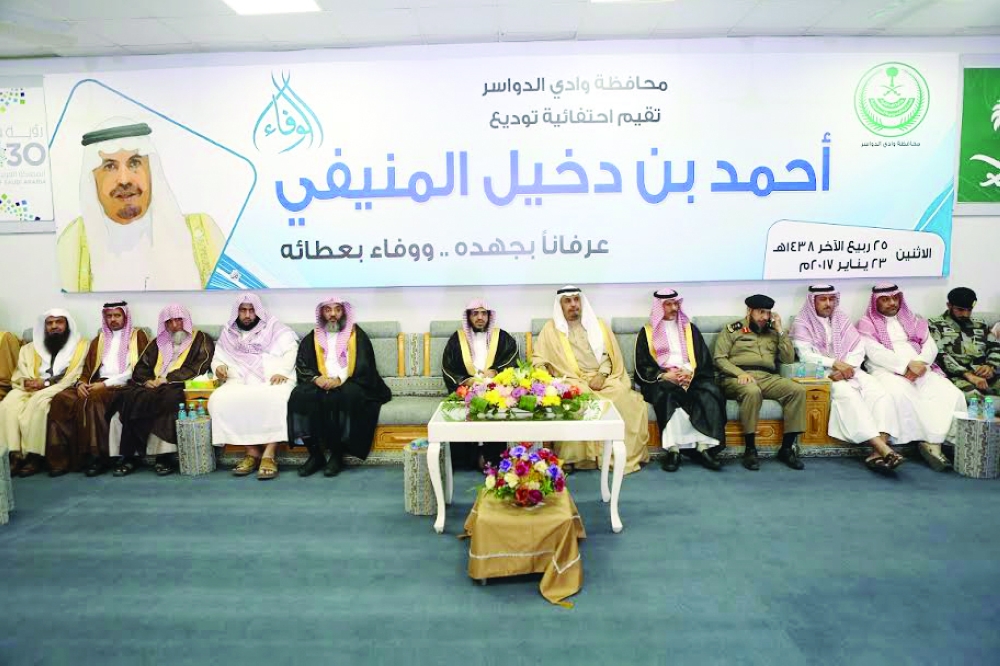 نظم منسوبو محافظة وادي الدواسر، حفلة تكريم للمحافظ السابق أحمد المنيفي، بمناسبة تقاعده عن العمل بعد 41 عاماً من العطاء، بحضور وكيل المحافظة أحمد العلم، ومسؤولي الجهات الحكومية والأمنية.