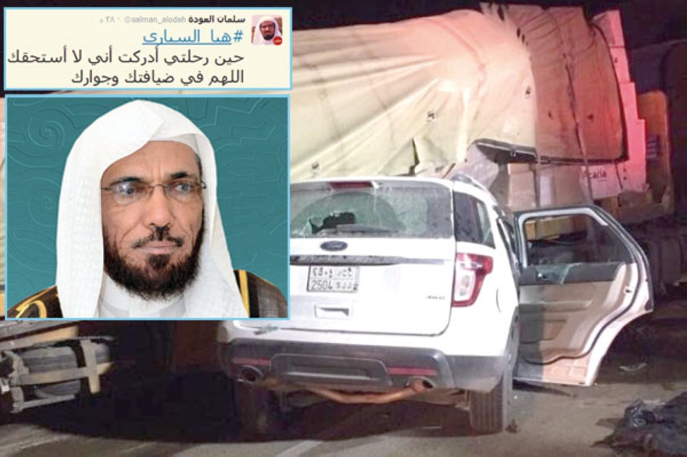 عبر الداعية الدكتور سلمان العودة، عن رضائه بقضاء الله وقدره في وفاة زوجته وابنه اللذين وافتهما المنية أمس (الأربعاء)، إثر حادث مروري مروع، فيما أصيب اثنان من أبنائه، بعد اصطدام السيارة التي تقلهم بشاحنـــة في طريق عودتهم من مدينة شقراء إلى الرياض.