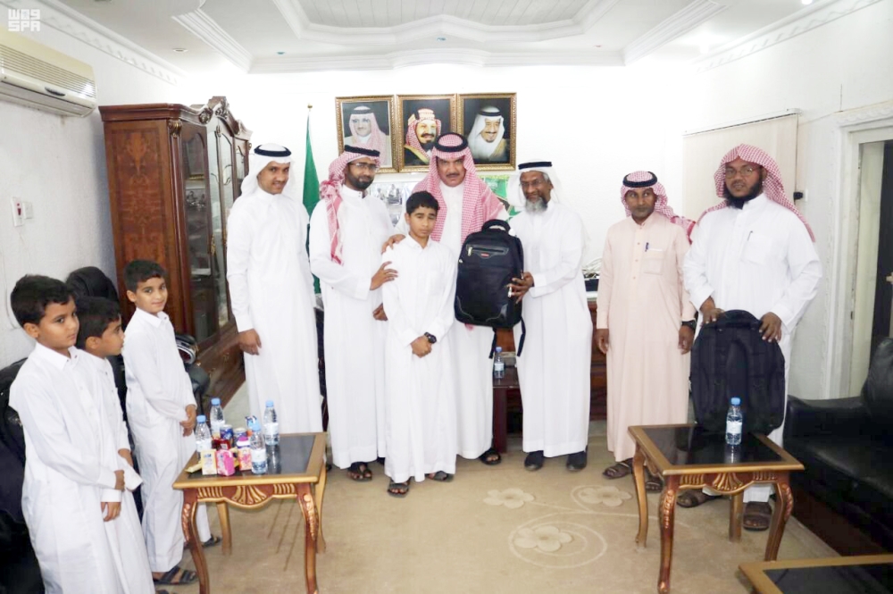 محافظ الطوال يسلم أحد الطلاب حقيبة. (عكاظ)