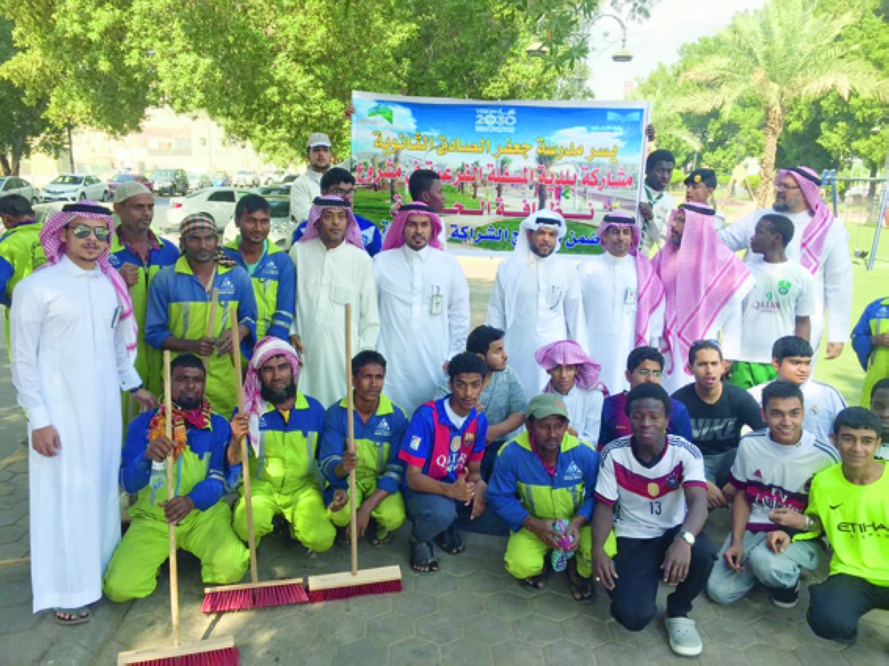 الطلاب مع منسوبي وعمال الأمانة. (عكاظ)