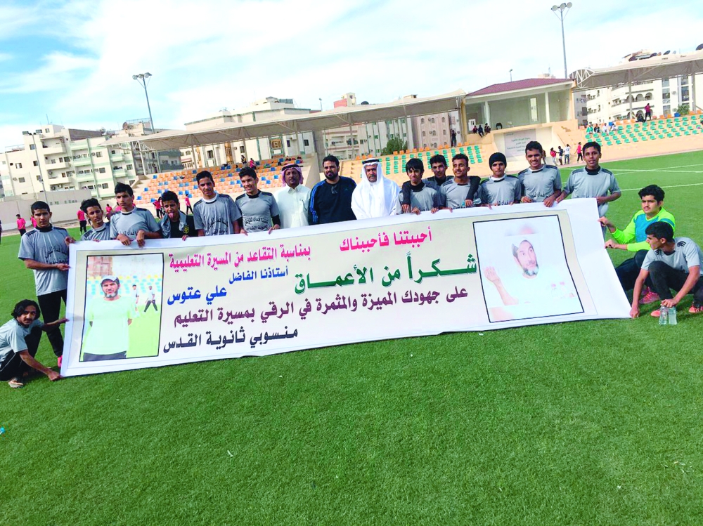بادر طلاب ثانوية القدس في المدينة المنورة، بتكريم معلم التربية علي العتوس بلافتة بعنوان «أحببتنا فأحببناك»، قبل إحدى مباريات بطولة كرة القدم بمناسبة تقاعده، بعد رحلة حافلة بالإنجاز في الميدان التربوي.