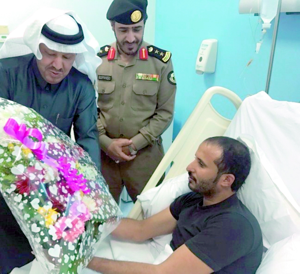 محافظ بلجرشي مقدما باقة ورد للجندي المصاب. (عكاظ)