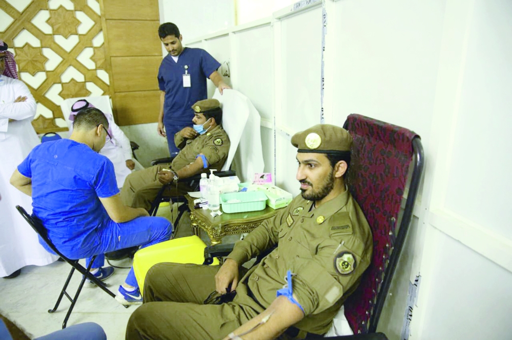 منسوبو قوات الحج أثناء تبرعهم بالدماء. (عكاظ)