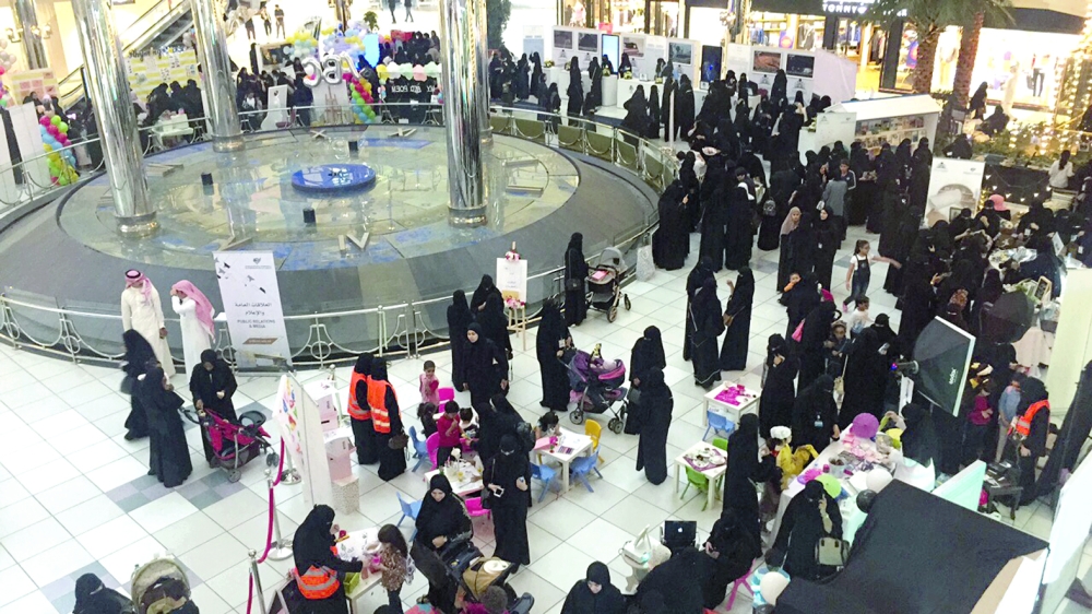 ركن طالبات قسم الجغرافيا استقطب زوار المعرض. (عكاظ)