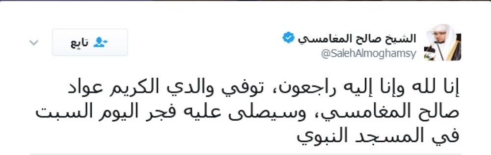 نعى إمام وخطيب مسجد قباء الشيخ صالح بن عراد المغامسي، والده عبر حسابه في تويتر.