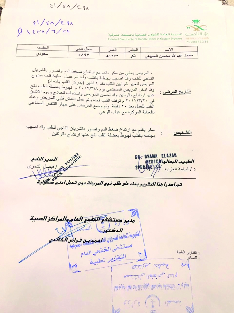 وأبدى السبيعي مخاوفه على صحة والده، خصوصا أن من يتابع حالته في مستشفى الخفجي طبيب باطنة، وليس أخصائي قلب، مناشدا النظر إلى معاناته، والعمل على نقله بالإخلاء الطبي في أسرع وقت.