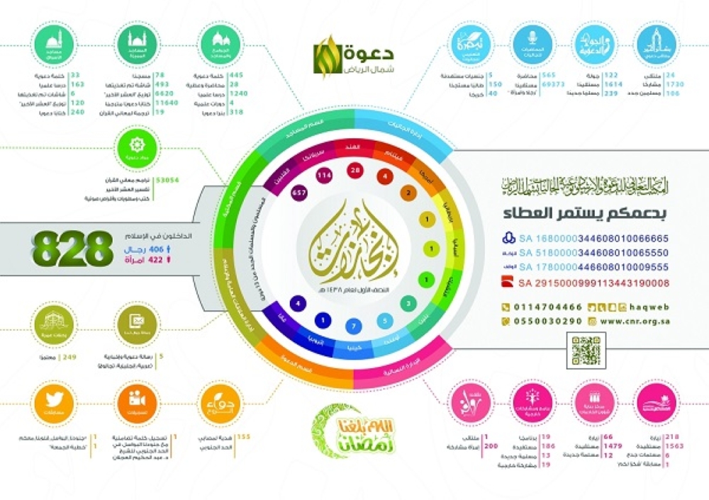 أعلن 828 رجلا وامرأة من 13 جنسية إسلامهم خلال النصف الأول من العام الحالي 1438هـ، في المكتب التعاوني للدعوة والإرشاد وتوعية الجاليات بشمال الرياض.