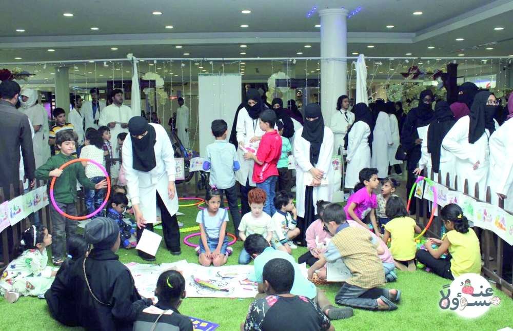 طالبات طب أم القرى مع الأطفال خلال الحملة. (عكاظ)