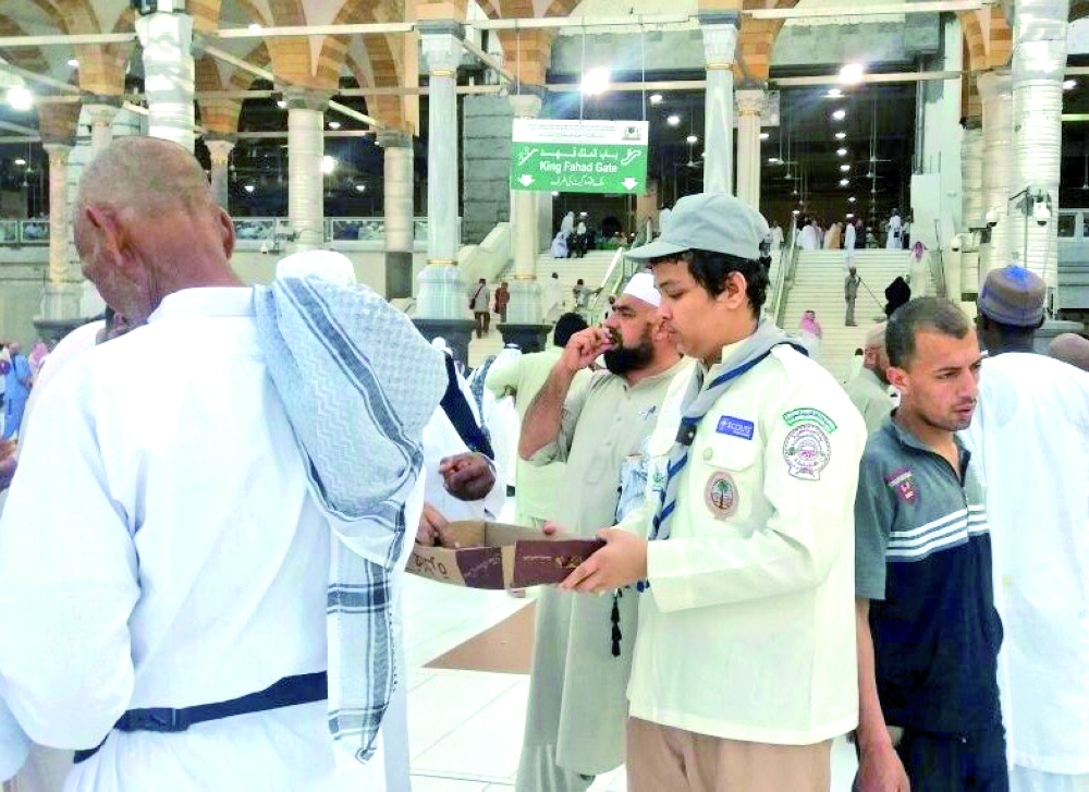أحد الكشافة يقدم التمر للمعتمرين. (عكاظ)