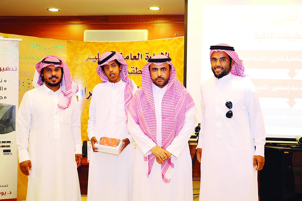 كرم مدير عام التعليم في منطقة حائل الدكتور يوسف الثويني الطلاب الفائزين في مسابقة «التطبيقات الذكية»، التي أشرفت عليها إدارة تقنية المعلومات (بنين/بنات)، وحصل على المركز الأول فيها نايف العنزي من مدرسة الشعلانية الثانوية، وحل ثانياً محمد إسماعيل من مدرسة نجد الثانوية، وجاء في المركز الثالث سلطان السعدي من مدرسة حنين الثانوية، فيما كرمت المساعدة للشؤون التعليمية فوزية الجنيدي الطالبات الفائزات في المسابقة ذاتها، وهن: وجدان اليامي، وأماني عبدالعال، ومريم الشمري في المراكز الأولى على التوالي.
