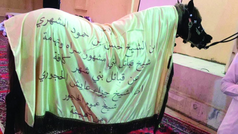 جرت العادة بعد مناسبات الزواج في ينبع، أن يقدم الأصدقاء هدايا للعريس كنوع من المشاركة في المناسبة وتعبير عن فرحتهم بصديقهم في ليلة العمر، وهذا الأمر أيضا ينطبق على والد العريس من أصدقائه وأقاربه، وتختلف الهديا بأشكالها وأنواعها، فمنهم من يفضل أن يضع هدايا مغلفة مخفية، ومنهم من يقوم بجلب هدايا عينية، ويصل الأمر إلى تقديم سيارات في بعض المناسبات، ولكن هذه المرة قدم أحد أصدقاء والد العريس هدية مختلفة تمثلت في حصان عربي أصيل من سلالة معروفة كهدية لوالد العريس وقام بإدخال الحصان إلى قاعة الاحتفال وسط الحضور، وتسليمه إلى والد العريس بيده ومعه شهادة تثبت أصل الحصان العربي في مشهد لم يعتد عليه الجيل الحالي من الشباب. وتقدم الشيخ جزاء بن عايش الحجوري شيخ قبيلة الحجور من جهينة بالشكر والعرفان لجميع شيوخ القبائل والضيوف الذين شاركوه أفراحه بمناسبة حفلة زفاف ابنه أحمد بإحدى قاعات الأفراح في ينبع.