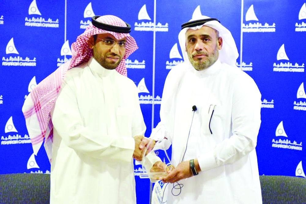 كرم نائب رئيس مجلس إدارة غرفة الشرقية محمد الفراج، مدير فرع معهد الإدارة العامة بالمنطقة الدكتور محمد باجنيد بدرع تذكارية، خلال لقاء الثلاثاء الشهري بالغرفة، الذي ناقش الخدمات التدريبية والاستشارية التي يقدمها المعهد، وإمكانية استفادة القطاع الخاص منها.
