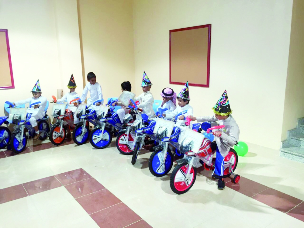 الطلاب عقب تسلمهم الدراجات الهوائية. (عكاظ)