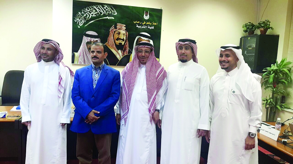 الحزنوي يتوسط شقيقه محمد ومناقشي الرسالة. (عكاظ)