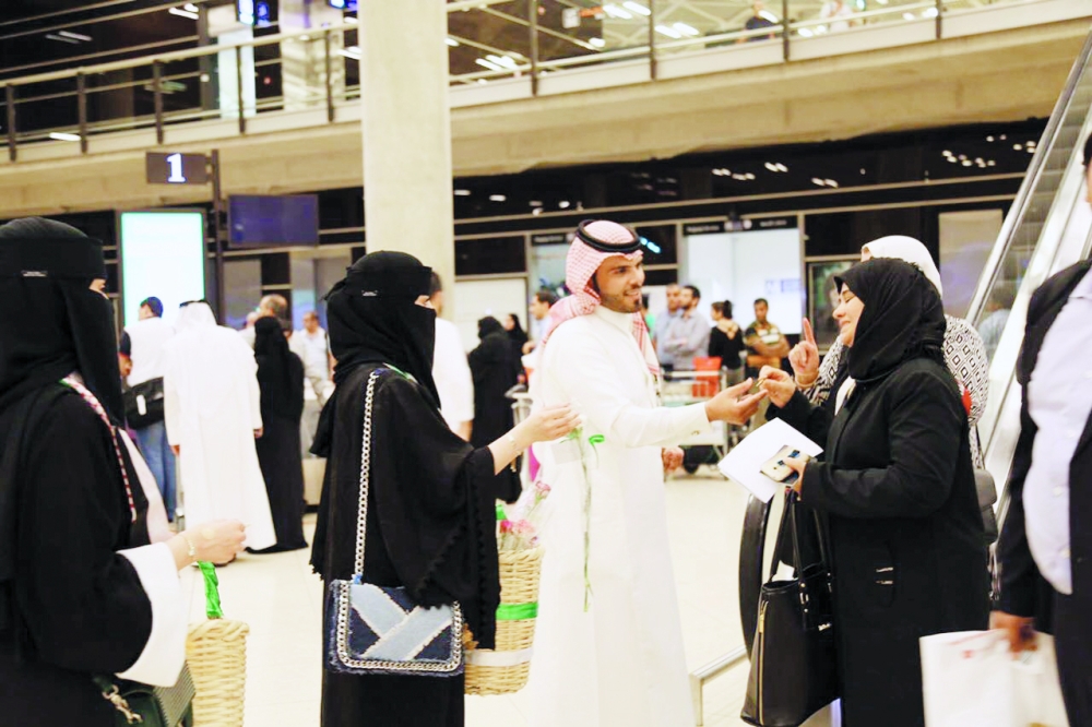 الطلاب السعوديون يستقبلون القادمين للأردن بالورود. (عكاظ)