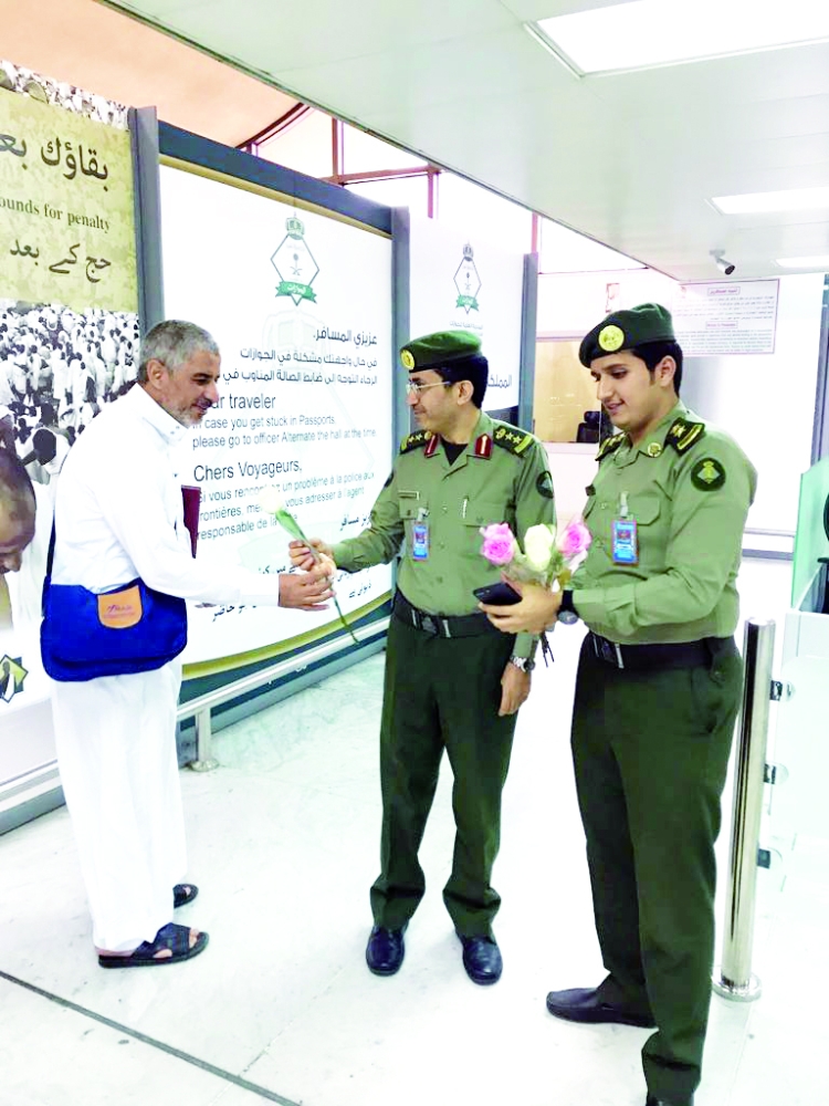 وتبنت إدارة جوازات المطار استقبال ضيوف بيت الله الحرام وتوديعهم بالهدايا والورود لتعكس حرص واهتمام حكومة خادم الحرمين الشريفين بضيوف بيت الله الحرام ولتكون الانطباع الأول والأخير للمعتمر أثناء وصوله وبعد مغادرته بمتابعة مباشرة.