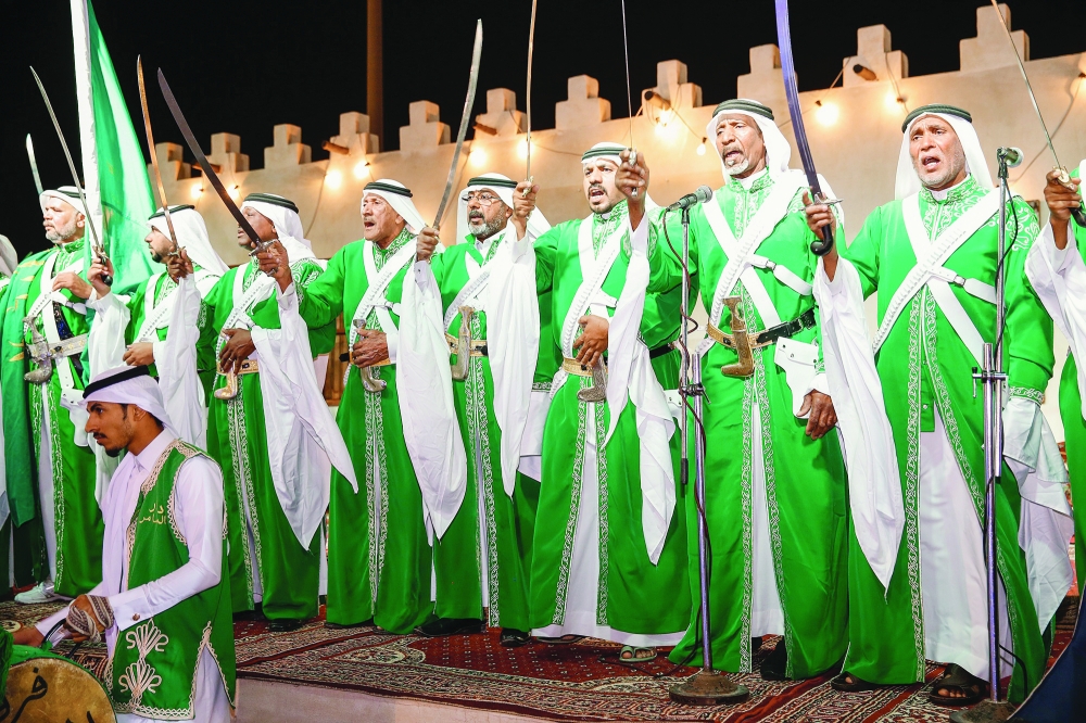 فرقة الأحساء الشعبية تشارك في إحدى المناسبات أخيراً. (عكاظ)