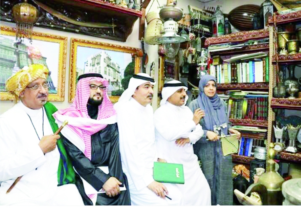 ثريا جان مع عدد من الزوار في دكان البلد. (عكاظ)