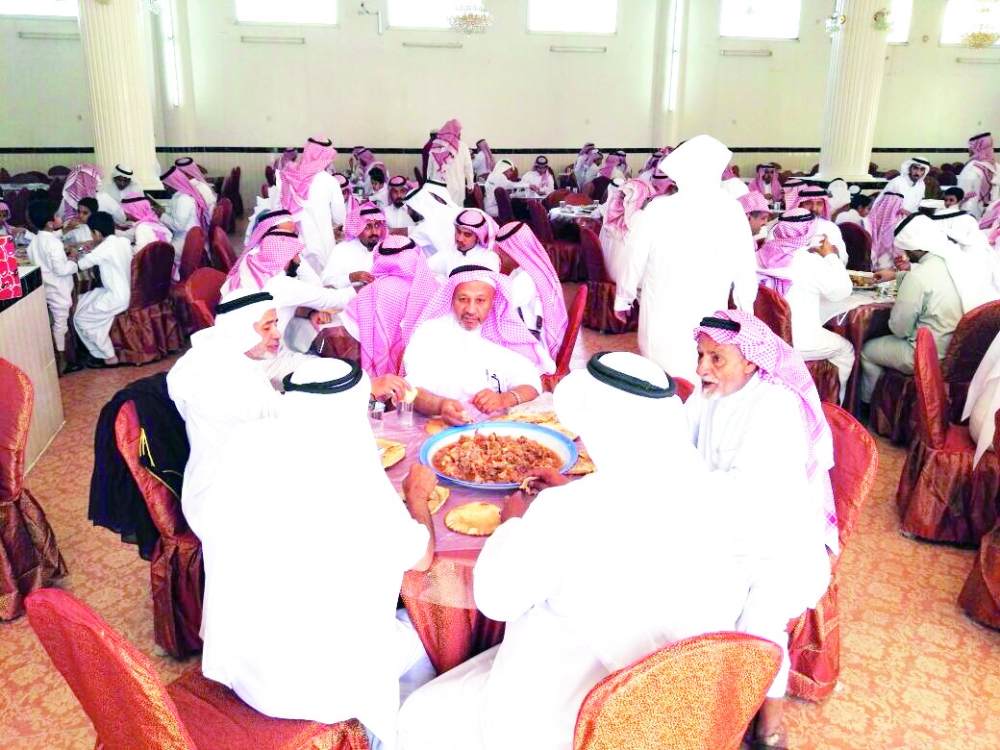 أهالي رهوة البر على مائدة الإفطار يوم العيد. (عكاظ)