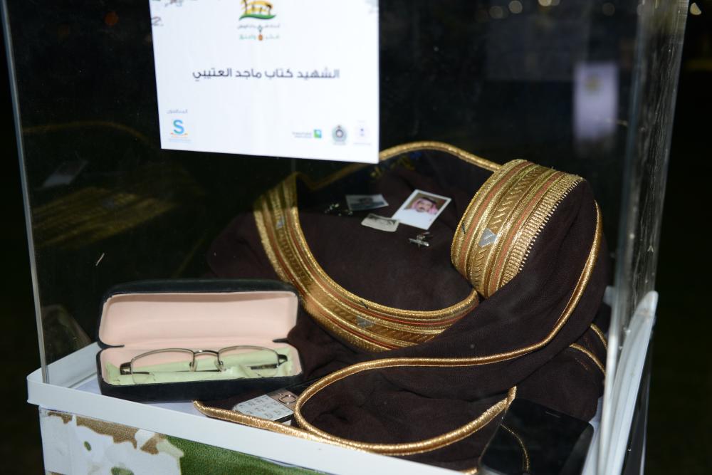 زوايا الفخر والاعتزاز تعددت منصاتها، التي حملت اسم شهيد الوطن «كتاب العتيبي»، الذي استشهد مدافعا عن أمن وطنه، إذ حضر أبناؤه فعالية «فخر واعتزاز» يحملون مشلحه الذي طالما لبسه في المناسبات، وكبكه، ونظارته الشخصية، وجهازه المحمول.